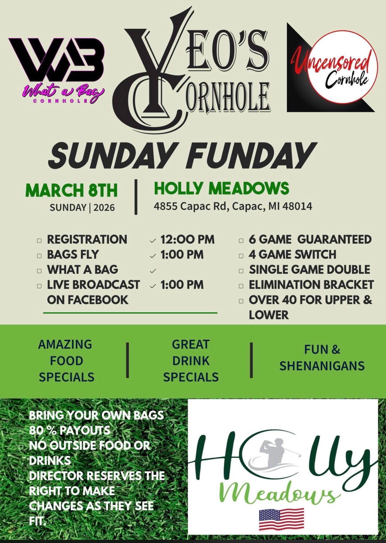 Located in the heart of Capac, Michigan, Holly Meadows is your local destination for great golf, good food, and unforgettable events. Enjoy our scenic 18-hole course, casual dining at Jr’s On The Green, and our brand-new banquet facility. Whether you’re here to play, relax, or celebrate, Holly Meadows offers a laid-back, friendly atmosphere for all.